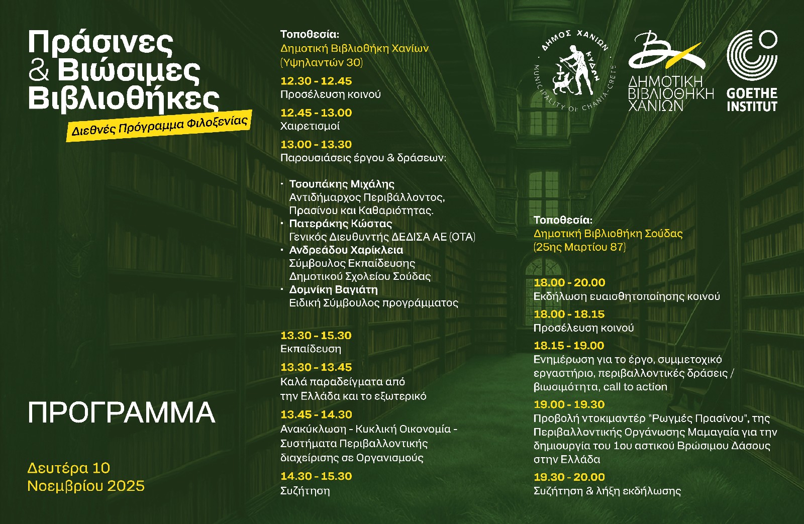 Στο πλαίσιο του προγράμματος, η Δημοτική Βιβλιοθήκη Χανίων υποδέχεται από τις 10 έως τις 14 Νοεμβρίου 2025 την ψυχοπαιδαγωγό – διαχειρίστρια περιβαλλοντικών έργων, Δομνίκη Βαγιάτη, η οποία συνεργάζεται με την Παιδική – Εφηβική Βιβλιοθήκη Σούδας για την υλοποίηση ενός εκπαιδευτικού και διαδραστικού προγράμματος, με στόχο την ενίσχυση της περιβαλλοντικής συνείδησης και της βιώσιμης δράσης.