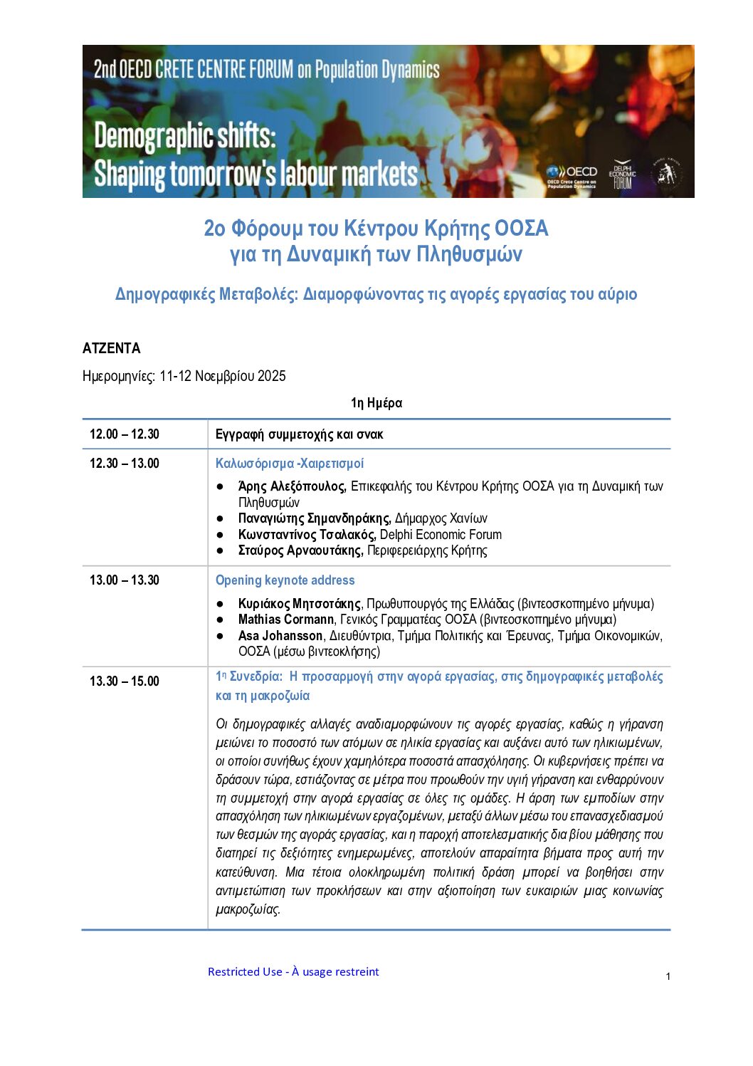 Το 2ο Ετήσιο Συνέδριο του Κέντρου Κρήτης του ΟΟΣΑ για τη Δυναμική των Πληθυσμών με τίτλο “Η πρόκληση του δημογραφικού: Διαμορφώνοντας τις αγορές εργασίας του μέλλοντος” θα διεξαχθεί την Τρίτη 11 Νοεμβρίου και την Τετάρτη 12 Νοεμβρίου στο Κέντρο Αρχιτεκτονικής Μεσογείου στα Χανιά, σε συνεργασία με τον Δήμο Χανίων και το Οικονομικό Φόρουμ των Δελφών.